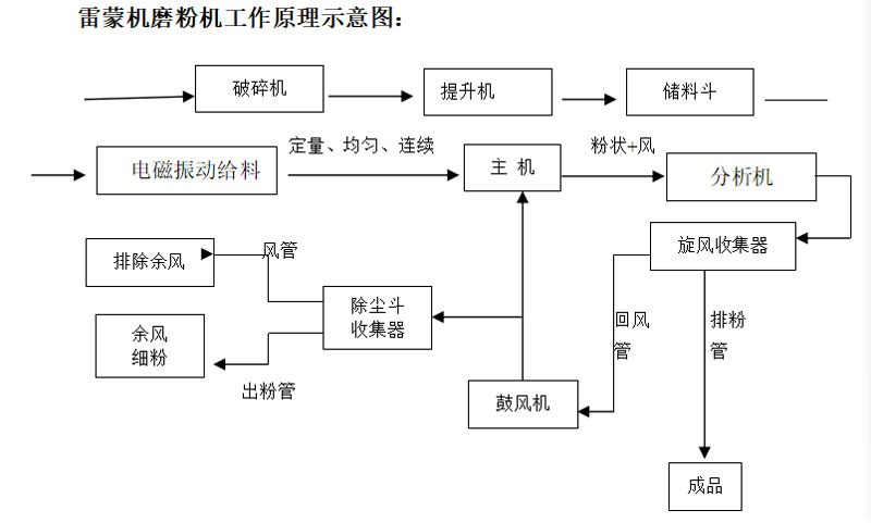 雷蒙机磨粉机的工作原理及结构简介 工作原理 本机由破碎机、提升机、储料斗、电磁振动给料机、鼓风机、主机、分析机、旋风收集器、管道系统、除尘斗、电控柜等组成(见下图)。 物料经破碎机破碎成小于20mm的...