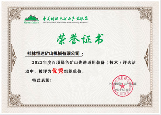 喜讯:桂林恒达矿山机械有限公司荣获中关村绿色矿山产业联盟“优秀组织单位”荣誉
